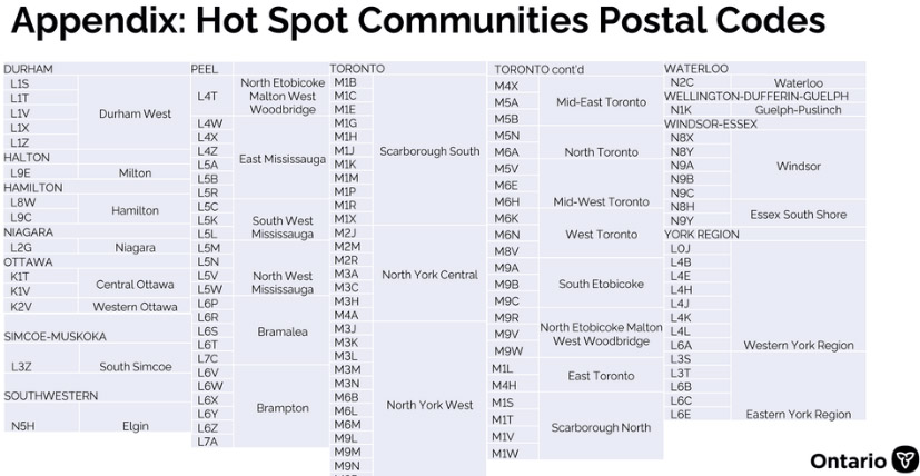 —— 安省卫生部在4月6日表示将在未来几周内以疫情“热点地区”邮政编码的形式向50岁及以上的居民提供新冠疫苗,安省新冠科学咨询组确定了13个公共卫生部门中的90个左右社区为疫情“热点地区”,该计划所包括的13个公共卫生部门是:Durham、Halton、Hamilton、Niagara、Ottawa、Peel、Simcoe-Muskoka、Southwestern、Toronto、Waterloo、Wellington-Dufferin-Guelph、Windsor-Essex 和 York Region。