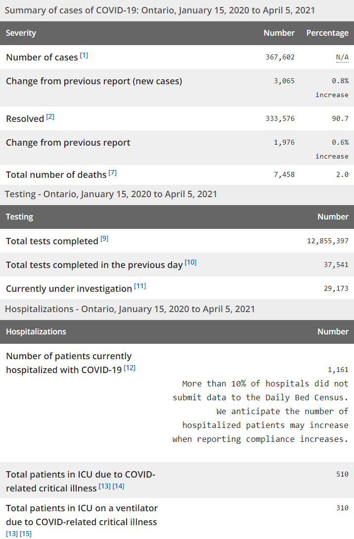 再看看安省方面的详细数据,截止4月5日,安省已对12,855,397例进行了新冠病毒检测(检测数较昨天新增37,541),还有29,173处于被调查阶段。确诊总数367,602(当天新增3065,阳性率上升至8.16%),包括333,576例康复(康复率下降为90.7%)、7,458例死亡(增加8例,死亡率仍为2.0%)。住院患者1161例(增加219,有10%医院没有更新数据);进入ICU患者510例(增加16);IU插呼吸机患者310例(增加17)。