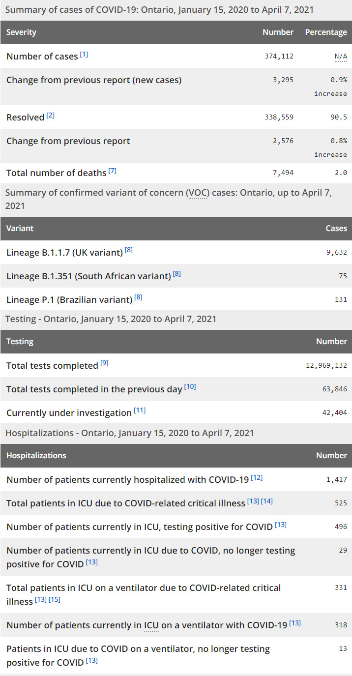再看看安省方面的详细数据,截止4月7日,安省已对12,969,132例进行了新冠病毒检测(检测数较昨天新增63,846),还有42,404处于被调查阶段。确诊总数374,112(当天新增3295,阳性率下降至5.16%),包括338,559例康复(康复率下降为90.5%)、7,494例死亡(增加19例,死亡率仍为2.0%)。住院患者1417例(增加20);进入ICU患者496例(增加20);IU插呼吸机患者331例(增加20)。