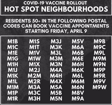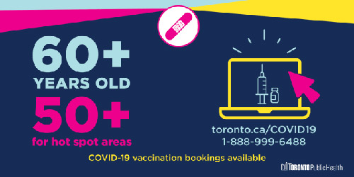 —— 多伦多市政府当天宣布,从4月9日8am起,年龄在50岁以上(出生于1971年或更早)且居住在热点邮政编码中的居民可以在由多伦多市政府运营的疫苗接种诊所(共9个,其中3个在4月12日开放)进行预约。网址: www.toronto.ca/covid-19 或致电 1-888-999-6488 进行预约。更多详情请点击加国生活网专稿《大多伦多地区疫苗接种预约指南》