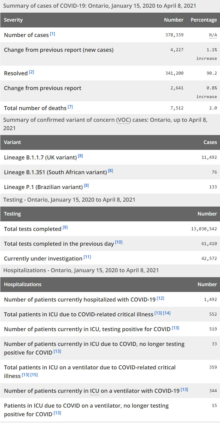 再看看安省方面的详细数据,截止4月8日,安省已对13,030,542例进行了新冠病毒检测(检测数较昨天新增61,410),还有42,572处于被调查阶段。确诊总数378,339(当天新增4227,阳性率上升至6.88%),包括341,200例康复(康复率下降为90.2%)、7,512例死亡(增加18例,死亡率仍为2.0%)。住院患者1492例(增加75);进入ICU患者552例(增加56);IU插呼吸机患者359例(增加28)。