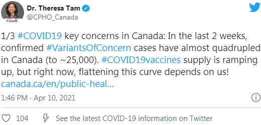 —— 加拿大首席公共卫生官Theresa Tam博士警告称,在过去的两周中,加拿大的变异病毒病例几乎翻了两番。截至4月8日,加拿大共有24,995例变异病毒病例,而相比之下的3月24日此类病例为6,325。Theresa Tam博士在Twitter上的帖子中写道:“在变异病毒激增的情况下,司法管辖区收紧了限制。这对我们所有人来说都是困难且令人沮丧的,但对于继续为我们提供重要物资、护理和支持的医疗保健和基本工人而言,则更为困难。”