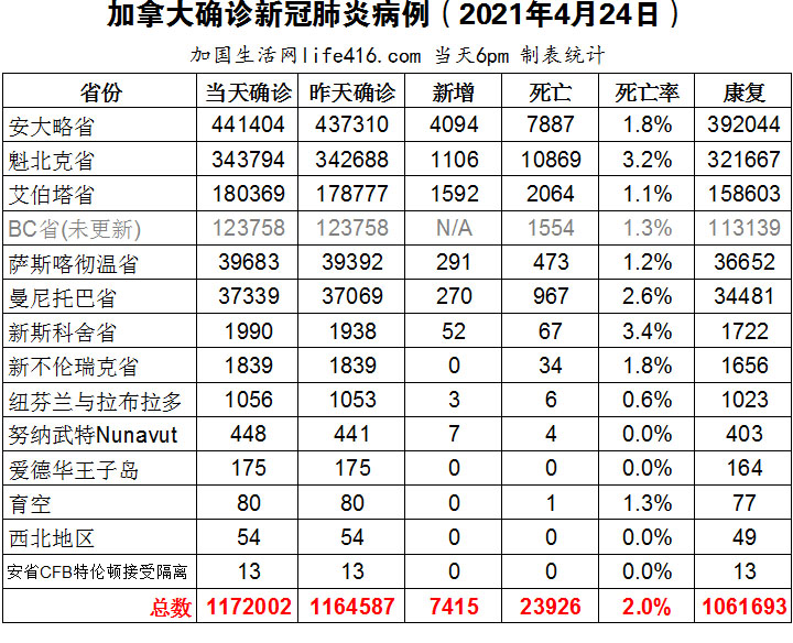 【加国生活网编译报道】截至2021年4月24日下午6点,加拿大新冠确诊病例总数为1172002(新增7415),死亡23926(新增43)。安省确诊总数441404(新增4094);魁省确诊总数343794(新增1106);艾省确诊总数180369(新增1592);BC省逢周末不更新;萨省确诊总数39683(新增291);曼省确诊总数37339(新增270)。加拿大首席公共卫生官称住院人数和重症监护病房人数仍在继续上升,全省各地医院都已满负荷运转;安省省长呼吁联邦政府立即关闭所有不必要前往加拿大的旅行;皮尔区卫生部宣布已部分关闭了两个亚马逊运营中心;安省首席验尸官表示一些新冠患者发病速度相当快,至少有25人在家中死亡。加国生活网专门制作了如下统计数据表: