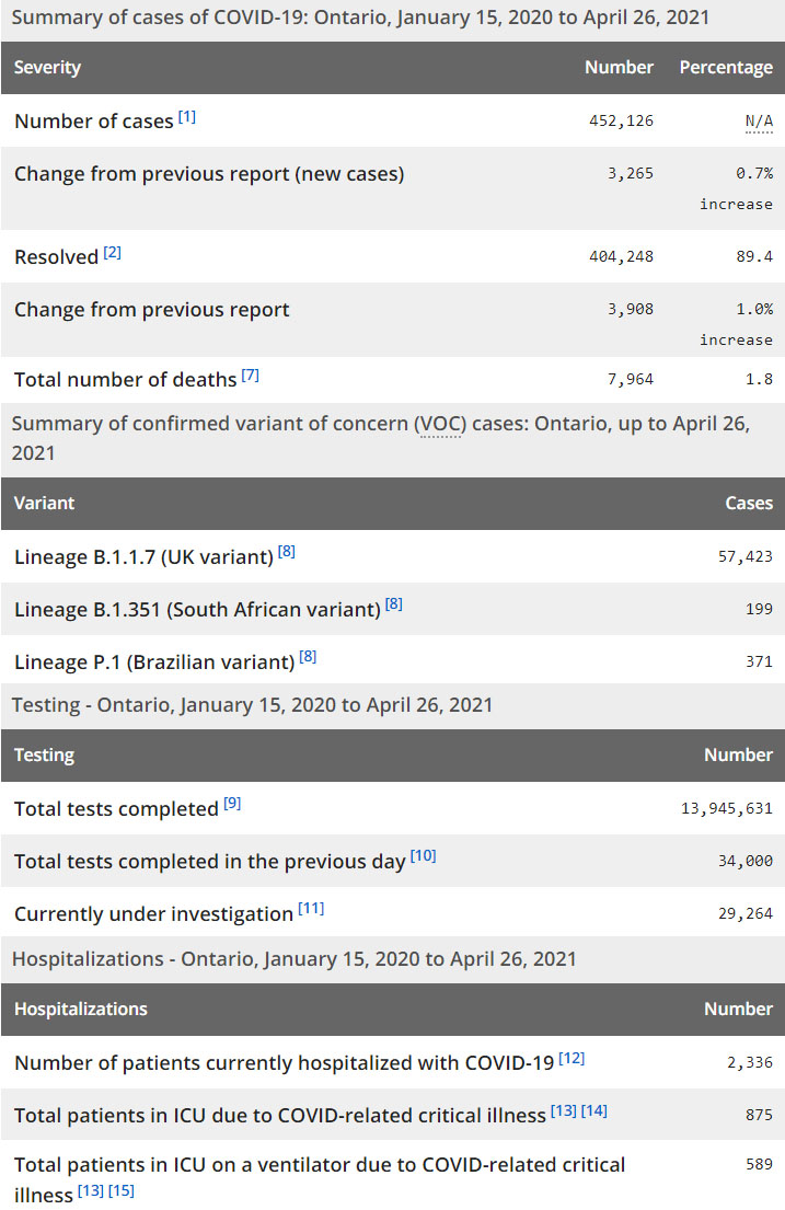 再看看安省方面的详细数据,截止4月26日,安省已对13,945,631例进行了新冠病毒检测(检测数较昨天新增34,000),还有29,264处于被调查阶段。确诊总数452,126(当天新增3265,阳性率下降至9.6%),包括404,248例康复(康复率上升为89.4%)、7,964例死亡(增加29例,死亡率仍为1.8%)。住院患者2336例(增加65);进入ICU患者875例(减少2);IU插呼吸机患者589例(减少16)。