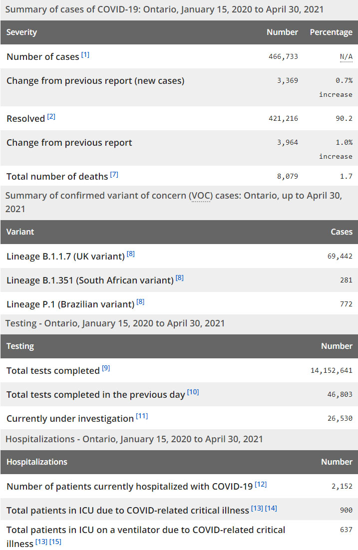再看看安省方面的详细数据,截止4月30日,安省已对14,152,641例进行了新冠病毒检测(检测数较昨天新增46,803),还有26,530处于被调查阶段。确诊总数466,733(当天新增3369,阳性率下降至7.2%),包括421,216例康复(康复率上升为90.2%)、8079例死亡(增加29例,死亡率仍为1.7%)。住院患者2152例(减少49);进入ICU患者900例(增加17);IU插呼吸机患者637例(增加5)。