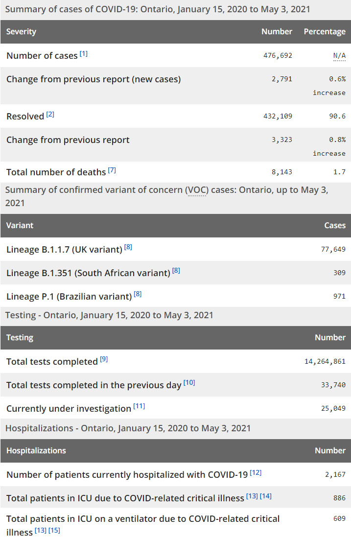 再看看安省方面的详细数据,截止5月3日,安省已对14,264,861例进行了新冠病毒检测(检测数较昨天新增33,740),还有25,049处于被调查阶段。确诊总数476,692(当天新增2791,阳性率下降至8.27%),包括432,109例康复(康复率上升为90.6%)、8143例死亡(增加25例,死亡率仍为1.7%)。住院患者2167例(增加242);进入ICU患者886例(减少3);IU插呼吸机患者609例(减少2)。