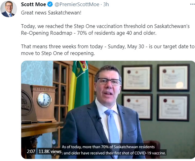 萨省完成“重新开放路线图”第一步为70%40岁以上省民接种疫苗 5月30日将放松部分限制措施 — 加拿大新冠肺炎新闻