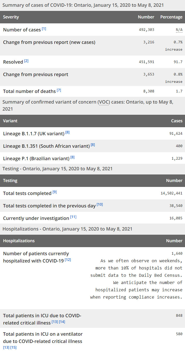 —— 安省在5月9日新增3,216例确诊病例,这其中多伦多903例、皮尔区752例、约克区335例、达勒姆区187例、渥太华150例;连续7天的新病例平均值从上周日记录的3588下降到3120。当天还新增47例死亡病例,达到“第三波”疫情的最高死亡记录,上一次最高记录是2月19日那一天曾创下的47例死亡病例。另外,安省的三种变异病毒的感染者总数已经达93,253例,其中B117型英国变异病毒91,624例、B1351型南非变异病毒400例、P1型巴西变异病毒1229例。