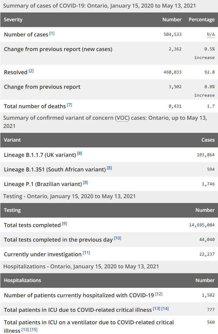再看看安省方面的详细数据,截止5月13日,安省已对14,695,084例进行了新冠病毒检测(检测数较昨天新增44,040),还有22,237处于被调查阶段。确诊总数504,533(当天新增2,362,阳性率下降至5.36%),包括468,033例康复(康复率上升为92.8%)、8,431例死亡(增加26例,死亡率仍为1.7%)。住院患者1,582例(减少50);进入ICU患者777例(增加1例);IU插呼吸机患者560例(减少8例)。