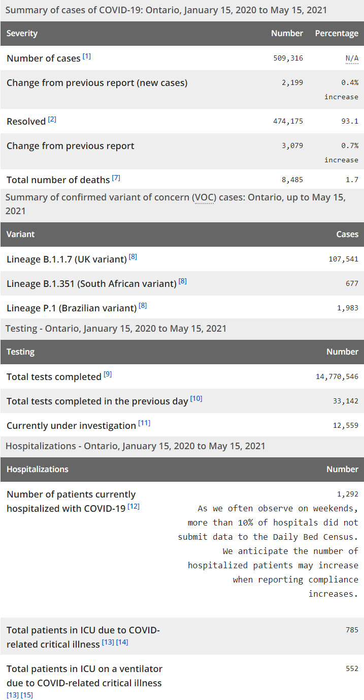 再看看安省方面的详细数据,截止5月15日,安省已对14,770,546例进行了新冠病毒检测(检测数较昨天新增33,142),还有12,559处于被调查阶段。确诊总数509,316(当天新增2,199,阳性率上升至6.64%),包括474,175例康复(康复率上升为93.1%)、8,485例死亡(增加30例,死亡率仍为1.7%)。住院患者1,292例(减少254,周末有10%医院未提交数据);进入ICU患者785例(未变);IU插呼吸机患者552例(减少8例)。