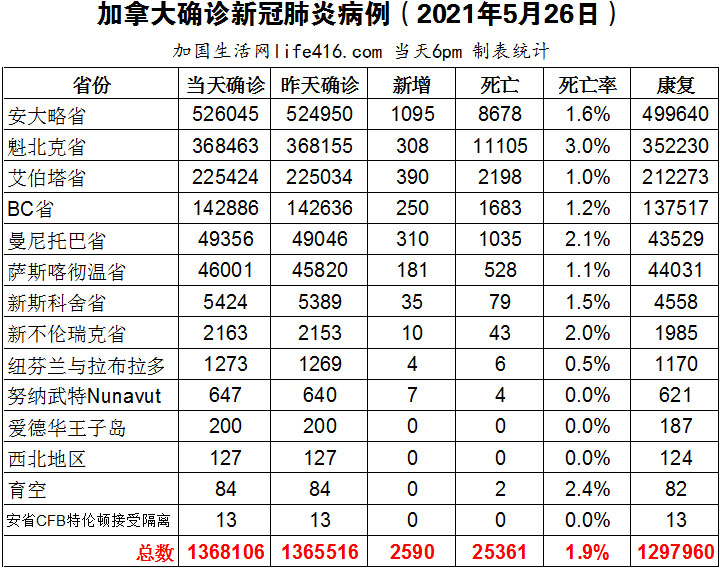 【加国生活网编译报道】截至2021年5月26日下午6点,加拿大新冠确诊病例总数为1368106(新增2590),死亡25361(新增37)。安省确诊总数526045(新增1095);魁省确诊总数368463(新增308);艾省确诊总数225424(新增390);BC省确诊总数142886(新增250);曼省确诊总数49356(新增310);萨省确诊总数46001(新增181)。艾省公布了三阶段重新开放计划,该计划直接与疫苗接种和住院人数挂钩,预计到7月,所有公共卫生限制都将取消;安省新增1,095例确诊病例,除了周二的1,039例感染之外,该数字是自3月16日以来最少的单日新增确诊病例;多伦多已有65%的18岁以上市民已经接种了至少一剂疫苗,安省全省已经接种53%,第一阶段开放指标是60%。加国生活网专门制作了如下统计数据表: