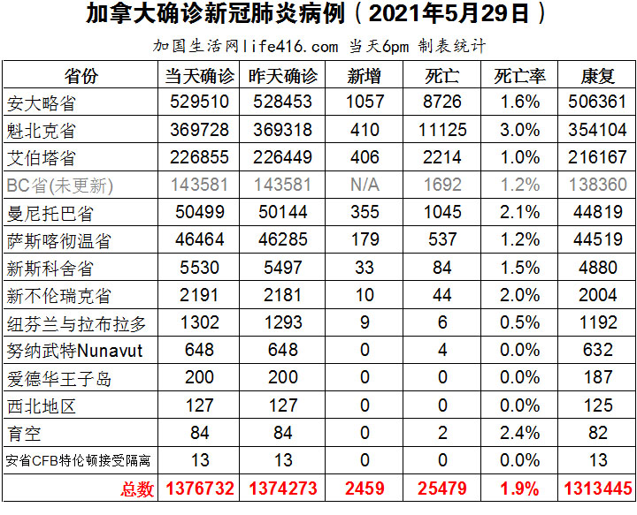 【加国生活网编译报道】截至2021年5月29日下午6点,加拿大新冠确诊病例总数为1376732(新增2459),死亡25479(新增38)。安省确诊总数529510(新增1057);魁省确诊总数369728(新增410);艾省确诊总数226855(新增406);BC省逢周末不更新;曼省确诊总数50499(新增355);萨省确诊总数46464(新增179)。为什么专家说现在应是推出第二剂疫苗的时候了? 安省已获得加拿大卫生部的许可,将某些批次的AstraZeneca疫苗的有效期从六个月延长至七个月;安省全省范围“居家令”将不会延长,但已延长了部分限制令至6月16日。加国生活网专门制作了如下统计数据表: