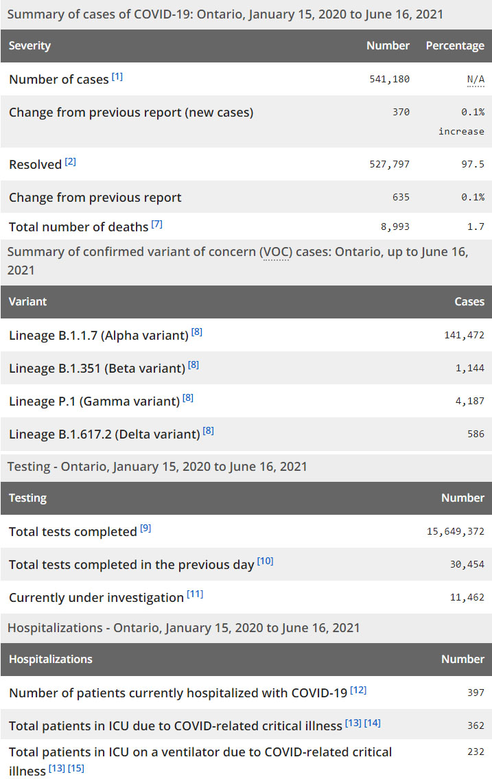 再看看安省方面的详细数据,截止6月16日,安省已对15,649,372例进行了新冠病毒检测(检测数较昨天新增30,454),还有11,462处于被调查阶段。确诊总数541,180(当天新增370,阳性率下降至1.21%),包括527,797例康复(康复率仍为97.5%)、8,993例死亡(增加7例,死亡率仍为1.7%)。住院患者397例(减少41);进入ICU患者362例(减少15);IU插呼吸机患者232例(减少10)。