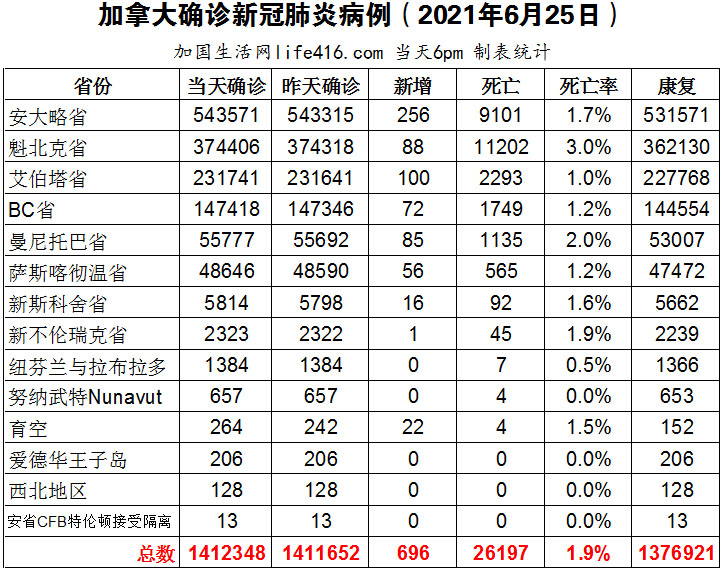 【加国生活网编译报道】截至2021年6月25日下午6点,加拿大新冠确诊病例总数为1412348(新增696),死亡26197(新增6)。安省确诊总数543571(新增256);魁省确诊总数374406(新增88);艾省确诊总数231741(新增100);BC省确诊总数147418(新增72);曼省确诊总数55777(新增85);萨省确诊总数48646(新增56)。加拿大联邦公共卫生部发布针对接种疫苗人士的公共卫生指南;加拿大首席卫生官认为增加年轻人的疫苗接种率是避免疫情卷土重来的关键;安省连续第5天低于300例,当天接种疫苗超过24.6万剂,再创单日记录;约克区公共卫生局建议12至17岁人士的二剂疫苗间隔是8周至16周。加国生活网专门制作了如下统计数据表: