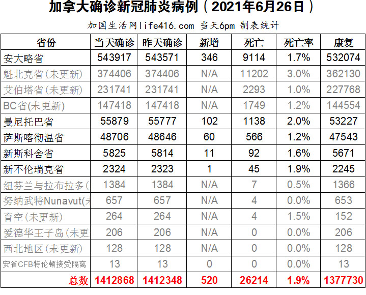 【加国生活网编译报道】截至2021年6月26日下午6点,加拿大新冠确诊病例总数为1412868(新增520),死亡26214(新增17)。安省确诊总数543917(新增346);魁省、艾省、BC省周末不更新;曼省确诊总数55879(新增102);萨省确诊总数48706(新增60)。加拿大公共卫生部发布疫苗接种后的统计数据,接受一剂或两剂疫苗人群感染率和死亡率很低;加拿大公共卫生部终于发布了针对接种疫苗人士的公共卫生指南,但专家们却表示这份迟来的指南仍然留下了许多悬而未决的问题。加国生活网专门制作了如下统计数据表: