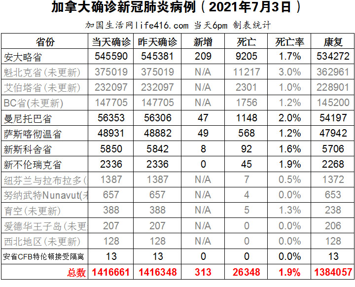 【加国生活网编译报道】截至2021年7月3日下午6点,加拿大新冠确诊病例总数为1416661(新增313),死亡26348(新增10)。安省确诊总数545590(新增209);魁省、艾省和BC省在周末不更新;曼省确诊总数56353(新增47);萨省确诊总数48931(新增49)。安省Halton地区一家长期护理院爆发Delta变异病毒疫情;育空在过去两天内新增31例确诊病例;美国传染病专家表示,未接种疫苗的人就像是潜在的变种病毒工厂。加国生活网专门制作了如下统计数据表: