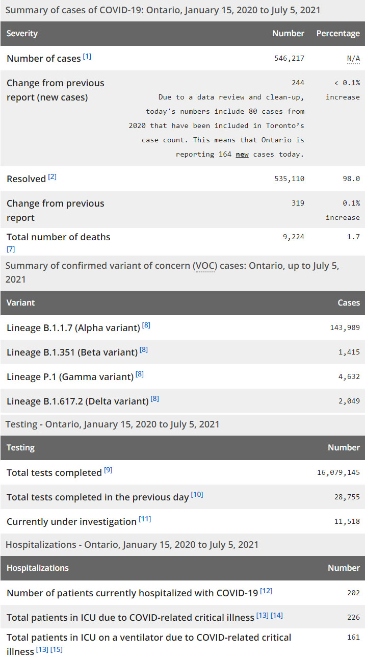 再看看安省方面的详细数据,截止7月5日,安省已对16,079,145例进行了新冠病毒检测(检测数较昨天新增28,755),还有11,518处于被调查阶段。确诊总数546,217(当天新增244,其中80例是多伦多卫生局在数据审查和清理过程中报告的2020年遗漏病例,也就是说当天实际新增的是164例;阳性率下降至0.85%),包括535,110例康复(康复率仍为98%)、9,224例死亡(增加9例,死亡率仍为1.7%)。住院患者202例(增加47);进入ICU患者226例(减少2);IU插呼吸机患者161例(增加4)。