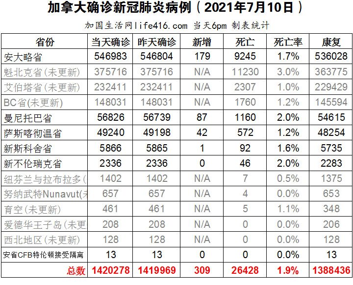 【加国生活网编译报道】截至2021年7月10日下午6点,加拿大新冠确诊病例总数为1420278(新增309),死亡26428(新增9)。安省确诊总数546983(新增179);魁省、艾省、BC省逢周末不更新;曼省确诊总数56826(新增87);萨省确诊总数49240(新增42)。加拿大正处于其疫苗推出的最关键时刻,也就是最后阶段。随着加拿大更多地区的重新开放,专家们纷纷表示,如果没有明确的遏制病毒传播的策略去堵上漏洞,加拿大注定要重蹈过去的覆辙。加国生活网专门制作了如下统计数据表:
