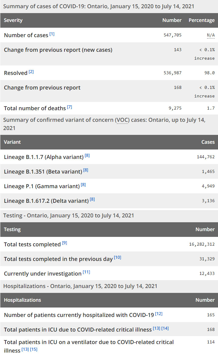 安省在7月15日新增143例确诊病例和10例死亡病例,在新增病例中,滑铁卢和Grey Bruce位居第一都是25例、多伦多20例、皮尔区7例、约克区5例。全省7天滚动平均病例也下降为155例,创自从去年9月7日以来的最低记录。但是,安省接种疫苗总数比上周同一天减少了10万多剂,公共卫生部门7月14日又集体接种了166,201剂疫苗,其中大约88%是第二剂,而在7月7日,安省接种了268,000剂。