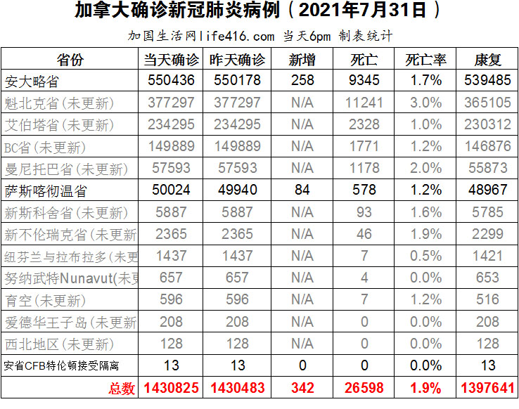 7月1日:加拿大国庆日,所有省份和地区的疫情数据都暂停更新