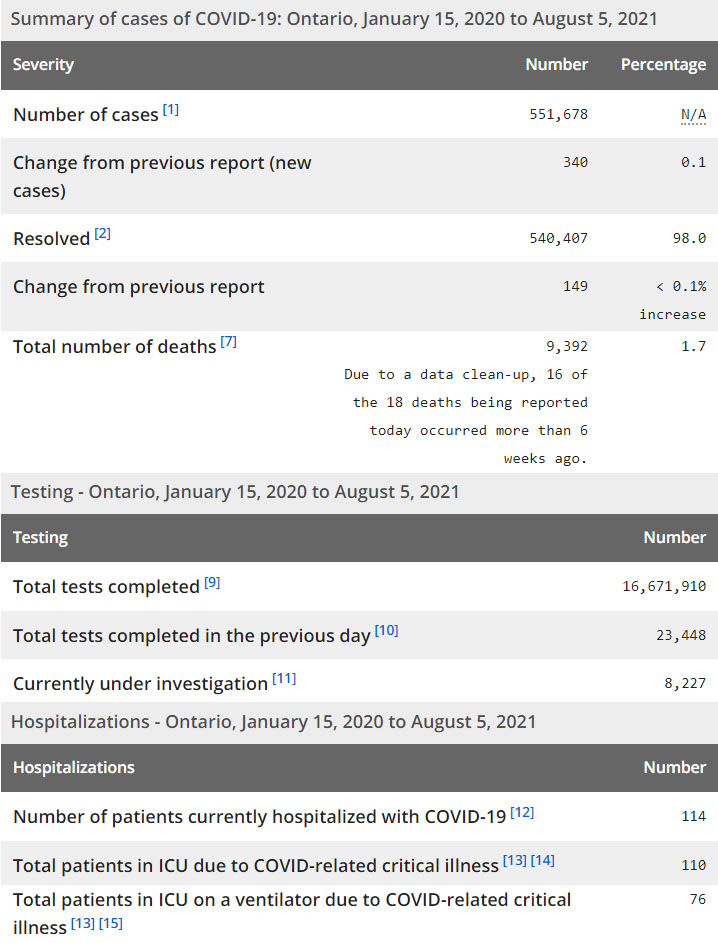 再看看安省方面的详细数据,截止8月5日,安省已对16,671,910例进行了新冠病毒检测(检测数较昨天新增23,448),还有8,227处于被调查阶段。确诊总数551,678(当天新增340;阳性率上升至1.45%),包括540,407例康复(康复率仍为98.0%)、9,392例死亡(新增18例,其中16例是6个多星期前的遗漏数据,死亡率仍为1.7%)。住院患者114例(增加1);进入ICU患者110例(未变);IU插呼吸机患者76例(减少1)。
