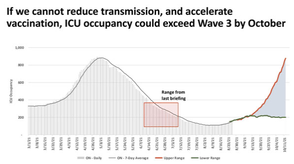 安省新冠科学咨询组证实安省正处于“第四波”疫情中,并表示其模型预测由此产生的病例增加将是“大量的激增”。接种疫苗可为严重病症提供实质性保护,预计接种疫苗人群的重症率会很低,而未接种疫苗人群的住院率和重症率都会迅速增加,因为工作场所和学样将在9月重新开放。“第四波”疫情将会影响所有年龄组,届时有可能超过ICU容量。如果安省不能减少病毒传播并加速疫苗接种,那么到10月,重症监护病房中感染人数可能会超过“第三波”。