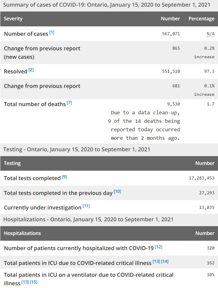 再看看安省方面的详细数据,截止9月1日,安省已对17,283,453例进行了新冠病毒检测(检测数较昨天新增27,293),还有13,835处于被调查阶段。确诊总数567,071(当天新增865;阳性率上升至3.17%),包括551,510例康复(康复率仍为97.3%)、9,530例死亡(新增14例,其中9例是2个月前的遗漏数据,死亡率仍为1.7%)。住院患者320例(减少19);进入ICU患者162例(减少1);IU插呼吸机患者105例(增加9)。