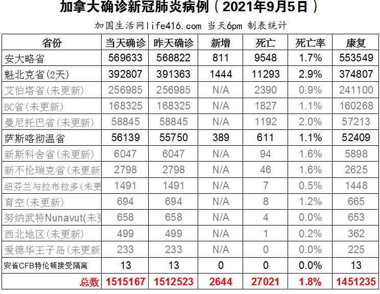 【加国生活网编译报道】由于明天9月6日是Labour Day假期,加拿大各个省和地区都会放假并停止更新,因此明天的疫情报道也将暂停一天。截至2021年9月5日下午6点,加拿大新冠确诊病例总数为1515167(新增2644),死亡27021(新增6)。安省确诊总数569633(新增811);魁省确诊总数392807(2天新增1444,当天新增778);萨省确诊总数56139(新增389);其余省份逢周末均未更新。随着BC省准备在9月中旬实施疫苗护照,企业主和执法部门正在寻求更多支持;艾省的重症监护室容量已达到95%;安省新增811例确诊病例,虽然比昨天944例有所下降,但仍然是连续第四天超过800例。加国生活网专门制作了如下统计数据表: