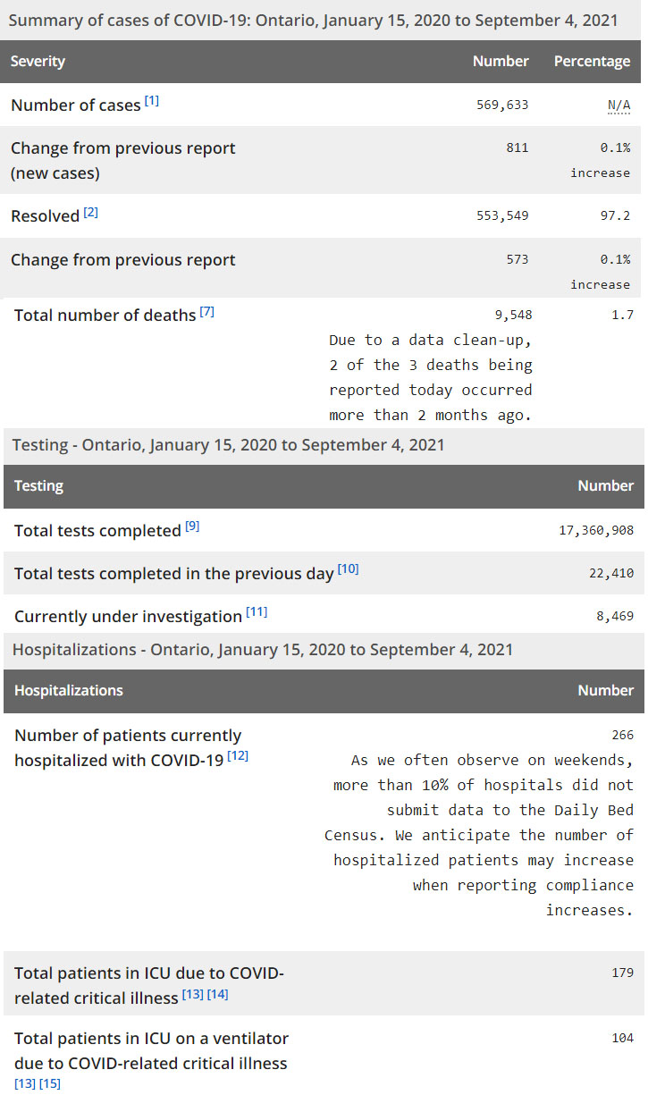 再看看安省方面的详细数据,截止9月4日,安省已对17,360,908例进行了新冠病毒检测(检测数较昨天新增22,410),还有8,469处于被调查阶段。确诊总数569,633(当天新增811;阳性率上升至3.62%),包括553,549例康复(康复率仍为97.2%)、9,548例死亡(新增3例,其中2例是2个月前的遗漏数据,死亡率仍为1.7%)。住院患者266例(减少43,有10%医院在周末没有提交数据);进入ICU患者179例(增加7);IU插呼吸机患者104例(增加7)。