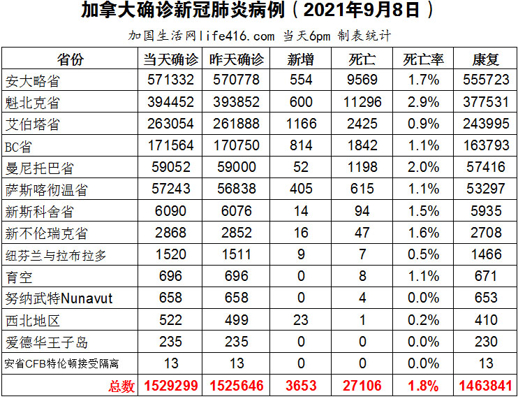 【加国生活网编译报道】截至2021年9月8日下午6点,加拿大新冠确诊病例总数为1529299(新增3653),死亡27106(新增39)。安省确诊总数571332(新增554);魁省确诊总数394452(新增600)、艾省确诊总数263054(新增1166)、BC省确诊总数171564(新增814);曼省确诊总数59052(新增52);萨省确诊总数57243(新增405)。加拿大边境从9月7日起所有已经完全接种疫苗的外国游客开放,虽然加拿大政府已采取强有力的卫生措施,但有专家认为这些措施并排万无一失,有专家认为外国游客风险非常低;安省连续第三天每日新增病例数低于600例。加国生活网专门制作了如下统计数据表: