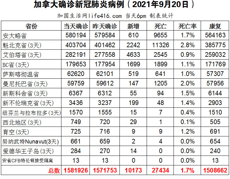 【加国生活网编译报道】截至2021年9月20日下午6点,加拿大新冠确诊病例总数为1581926(3天新增10173,当天新增4051),死亡27434(新增46)。安省确诊总数580194(新增610);魁省确诊总数403704(3天增2242,当天新增679);艾省确诊总数282191(3天增4633,当天新增1436);BC省确诊总数179653(3天增1699,当天新增442);萨省确诊总数62620(新增519);曼省确诊总数59759(3天增147,当天新增42)。辉瑞公司在9月20日表示他们所生产的Comirnaty疫苗在5至11岁的儿童中引起了强烈的免疫反应,他们计划很快向加拿大和美国申请授权该年龄段儿童使用其疫苗。加国生活网专门制作了如下统计数据表: