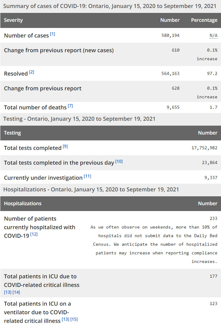 再看看安省方面的详细数据,截止9月19日,安省已对17,752,982例进行了新冠病毒检测(检测数较昨天新增23,864),还有9,337处于被调查阶段。确诊总数580,194(当天新增610;阳性率上升至2.56%),包括564,163例康复(康复率仍为97.2%)、9,655例死亡(新增2例,死亡率仍为1.7%)。住院患者233例(减少12,周末有10%医院没有更新数据);进入ICU患者177例(减少5);IU插呼吸机患者123(减少6)。