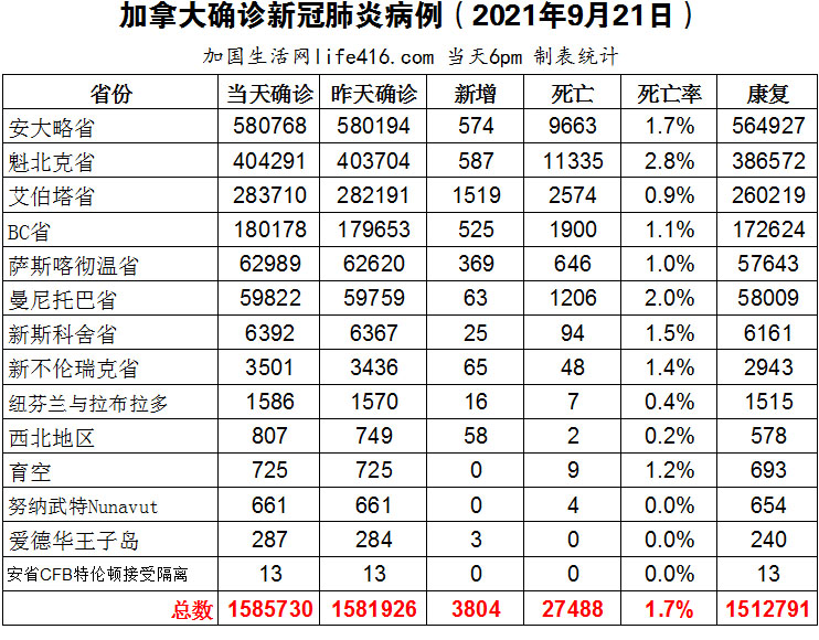 【加国生活网编译报道】截至2021年9月21日下午6点,加拿大新冠确诊病例总数为1585730(新增3804),死亡27488(新增54)。安省确诊总数580768(新增574);魁省确诊总数404291(新增587);艾省确诊总数283710(新增1519);BC省确诊总数180178(新增525);萨省确诊总数62989(新增369);曼省确诊总数59822(新增63)。自疫情开始以来,一直没有爆发疫情的爱德华王子岛PEI疫情激增,省长宣布将在10月初引入疫苗接种证明系统;安省明天实施疫苗护照系统,首席卫生官恳请省民要保持冷静和耐心,每个人都会有一个学习过程,请互相体谅。加国生活网专门制作了如下统计数据表: