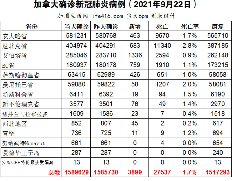 【加国生活网编译报道】截至2021年9月22日下午6点,加拿大新冠确诊病例总数为1589629(新增3899),死亡27537(新增49)。安省确诊总数581231(新增463);魁省确诊总数404974(新增683);艾省确诊总数285046(新增1336);BC省确诊总数180937(新增759);萨省确诊总数63415(新增426);曼省确诊总数59880(新增58)。安省在9月22日正式启动了“疫苗护照”系统,要求必须省民出示疫苗接种证明和身份证明,才能进入全省数千个非必要场所,快看安省疫苗护照使用攻略!加国生活网专门制作了如下统计数据表: