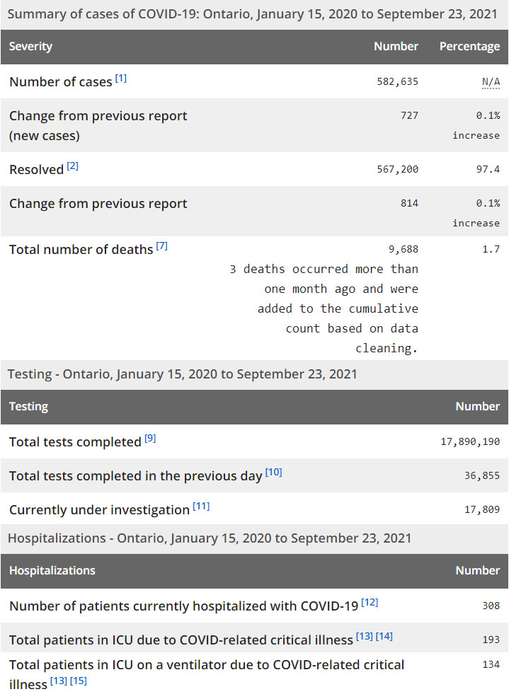 再看看安省方面的详细数据,截止9月23日,安省已对17,890,190例进行了新冠病毒检测(检测数较昨天新增36,855),还有17,809处于被调查阶段。确诊总数582,635(当天新增727;阳性率上升至1.97%),包括567,200例康复(康复率上升为97.4%)、9,688例死亡(新增11例,其中3例为1个多月前的遗漏数据,死亡率仍为1.7%)。住院患者308例(增加1);进入ICU患者193例(未变);IU插呼吸机患者134(未变)。