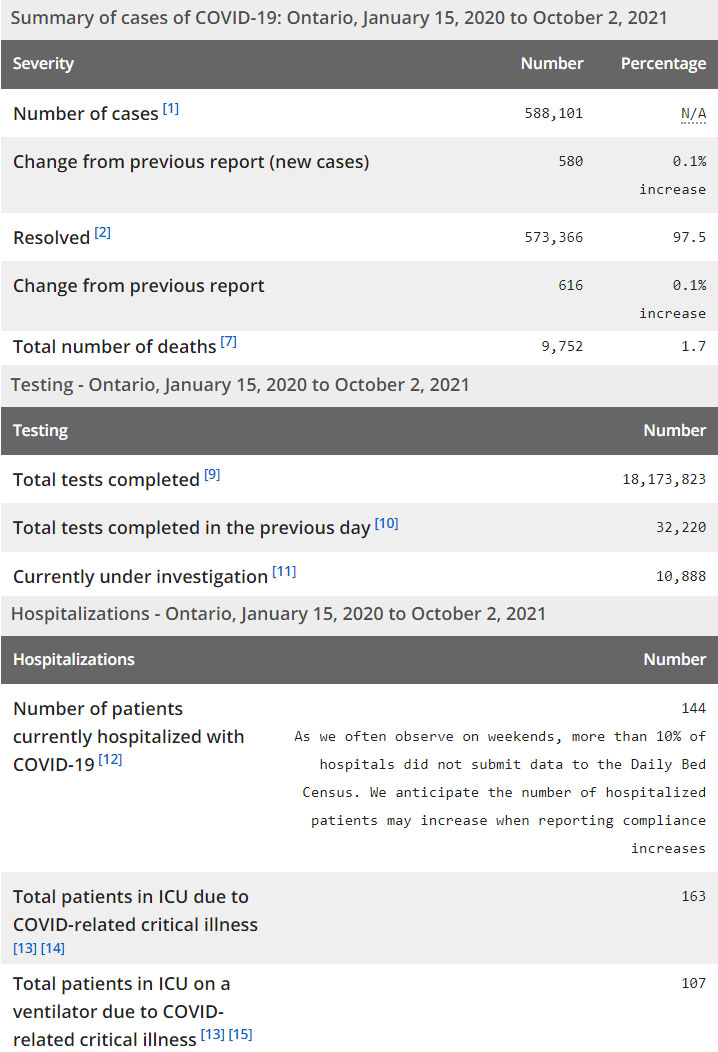 再看看安省方面的详细数据,截止10月2日,安省已对18,173,823例进行了新冠病毒检测(检测数较昨天新增32,220),还有10,888处于被调查阶段。确诊总数588,101(当天新增580;阳性率下降至1.8%),包括573,366例康复(康复率仍为97.5%)、9,752例死亡(新增2例,死亡率仍为1.7%)。住院患者144例(减少130,周末有10%医院未更新数据);进入ICU患者163例(增加1);IU插呼吸机患者107(减少3)。