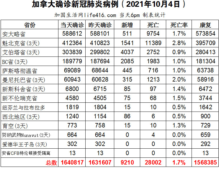 【加国生活网编译报道】截至2021年10月4日下午6点,加拿大新冠确诊病例总数为1640817(3天新增9210,当天新增3595),死亡28002(新增55)。安省确诊总数588612(新增511);魁省确诊总数412364(3天新增1541,当天新增402);艾省确诊总数303839(3天新增4037,当天新增1126);BC省确诊总数189779(3天新增2239,当天新增662);萨省确诊总数69089(新增445);曼省确诊总数60943(3天新增315,当天新增83)。BC省决定从10月4日开始,所有省内公立或私立学校就读的学生,无论年龄大小,都必须戴口罩上课;艾省9月疫情最严重,住院率和重症监护入住率和死亡率都屡创新高;安省新冠疫情科学组负责人表示,安省应该为疫情热点社区的小学生提供快速测试,但前提是每日新增确诊病例是当前水平的两倍。加国生活网专门制作了如下统计数据表: