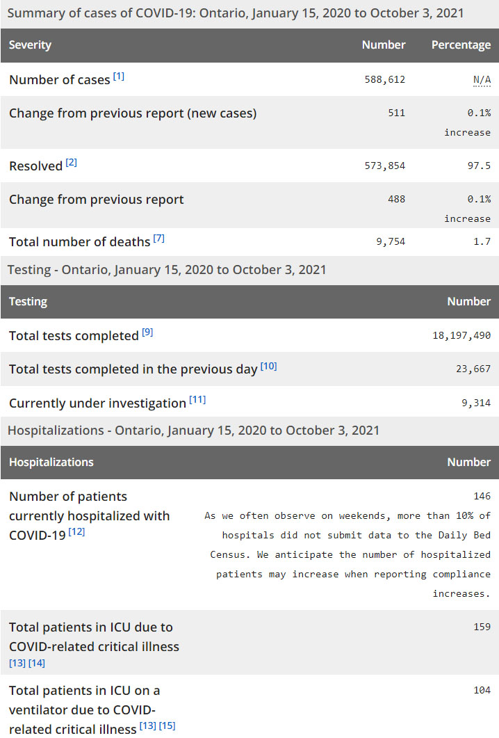 再看看安省方面的详细数据,截止10月3日,安省已对18,197,490例进行了新冠病毒检测(检测数较昨天新增23,667),还有9,314处于被调查阶段。确诊总数588,612(当天新增511;阳性率上升至2.16%),包括573,854例康复(康复率仍为97.5%)、9,754例死亡(新增2例,死亡率仍为1.7%)。住院患者146例(增加2,周末有10%医院未更新数据);进入ICU患者159例(减少4);IU插呼吸机患者104(减少3)。