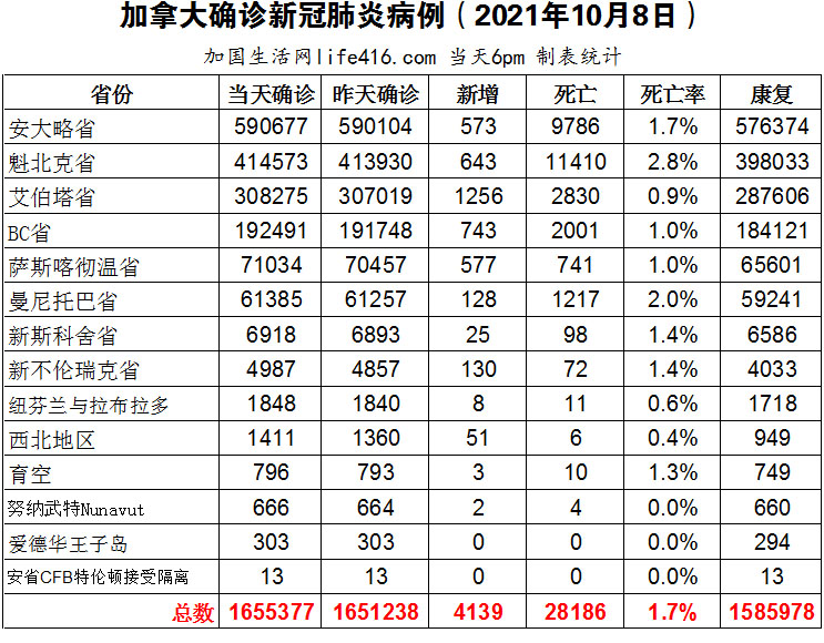 【加国生活网编译报道】截至2021年10月8日下午6点,加拿大新冠确诊病例总数为1655377(新增4139),死亡28186(新增45)。安省确诊总数590677(新增573);魁省确诊总数414573(新增643);艾省确诊总数308275(新增1256);BC省确诊总数192491(新增743);萨省确诊总数71034(新增577);曼省确诊总数61385(新增128)。自7月中旬以来,加拿大新冠病毒的繁殖数首次低于1,这意味着加拿大的新感染确诊病例数月来首次呈下降趋势; 加拿大统计局表示,加拿大经济上个月新增了15.7万个新工作岗位,足以使就业人数恢复到疫情开始前的水平;美国将接受接种了美国监管机构或世界卫生组织WHO授权疫苗的国际游客。加国生活网专门制作了如下统计数据表: