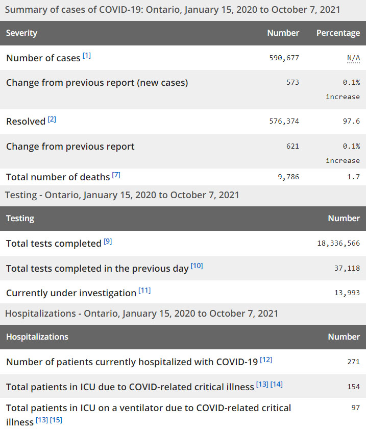 再看看安省方面的详细数据,截止10月7日,安省已对18,336,566例进行了新冠病毒检测(检测数较昨天新增37,118),还有13,993处于被调查阶段。确诊总数590,677(当天新增573;阳性率下降至1.54%),包括576,374例康复(康复率仍为97.6%)、9,786例死亡(新增10例,死亡率仍为1.7%)。住院患者271例(减少8);进入ICU患者154例(增加5);IU插呼吸机患者97(减少5)。