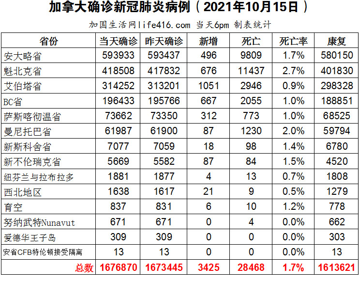 【加国生活网编译报道】截至2021年10月15日下午6点,加拿大新冠确诊病例总数为1676870(新增3425),死亡28468(新增47)。安省确诊总数593933(新增496);魁省确诊总数418508(新增676);艾省确诊总数314252(新增1051);BC省确诊总数196433(新增667);萨省确诊总数73662(新增312);曼省确诊总数61987(新增87)。接种混合疫苗并有美国旅行计划的加拿大人终于可以松一口气了,美国终于接受混种疫苗外国游客入境;安省正式上线了含有二维码的增强型疫苗证书,省民需要根据出生月份分批次下载。加国生活网专门制作了如下统计数据表: