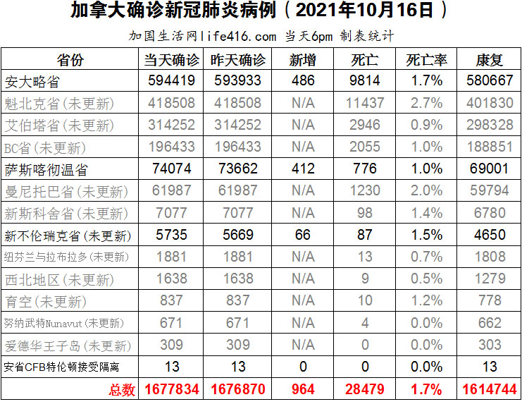 【加国生活网编译报道】截至2021年10月16日下午6点,加拿大新冠确诊病例总数为1677834(新增964),死亡28479(新增11)。安省确诊总数594419(新增486);萨省确诊总数74074(新增412);新不伦瑞克省确诊总数5735(新增66)。加拿大首席卫生官警告,虽然加拿大全国的每日新增确诊病例仍呈下降趋势,但严重的流感季节可能会给医疗保健系统带来更大压力。防止流感病毒的传播将是保护医疗保健系统的关键,并鼓励加拿大人继续积极采取卫生措施。加国生活网专门制作了如下统计数据表: