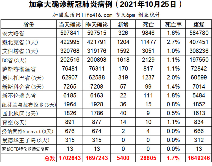 【加国生活网编译报道】截至2021年10月25日下午6点,加拿大新冠确诊病例总数为1702643(3天新增5400,当天新增1898),死亡28805(3天新增63)。安省确诊总数597841(新增326);魁省确诊总数422995(3天新增1204,当天新增324);艾省确诊总数320768(3天新增1592,当天新增368);BC省确诊总数202516(3天新增1618,当天新增476);萨省确诊总数76481(新增170);曼省确诊总数62907(3天新增319,当天新增78)。Moderna公司在10月25日宣布其低剂量的疫苗是安全的,并在6至11岁的儿童中产生免疫反应;安省连续七天平均每天新增确诊372例比上周进一步下降;BC省周末三天新增1618例,在全国各省中居首位。加国生活网专门制作了如下统计数据表: