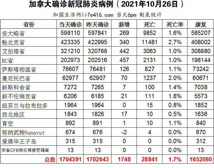 【加国生活网编译报道】截至2021年10月26日下午6点,加拿大新冠确诊病例总数为1704391(新增1748),死亡28841(新增36)。安省确诊总数598110(新增269);魁省确诊总数423335(新增340);艾省确诊总数321210(新增442);BC省确诊总数202973(新增457);萨省确诊总数76607(新增126);曼省确诊总数62977(新增70)。美国食品和药物管理局咨询委员一致投票赞成为5至11岁儿童接种辉瑞疫苗,最终还需要美国疾病控制和预防中心在下周决定是否批准;安省教育部长表示,如果安省强制要求教育工作者接种疫苗,则可能有5万名教育工作者失业。加国生活网专门制作了如下统计数据表: