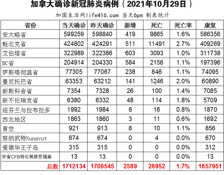 【加国生活网编译报道】截至2021年10月29日下午6点,加拿大新冠确诊病例总数为1712134(新增2589),死亡28952(新增24)。安省确诊总数599259(新增419);魁省确诊总数424802(新增511);艾省确诊总数322989(新增603);BC省确诊总数204914(新增584);萨省确诊总数77305(新增238);曼省确诊总数63353(新增141)。美国食品和药物管理局批准了辉瑞儿童疫苗可用于5至11岁儿童,加拿大卫生部则表示已知道该机构的举动,并重申其审查正在进行中;加拿大国家免疫咨询委员会更新新冠疫情指南,建议“应该”对80岁及以上的成年人接种第三剂疫苗,并建议其他一些群体也“可能”成为有资格的人群。加国生活网专门制作了如下统计数据表: