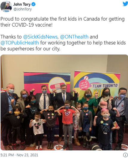 安省也已经于11月23日上午8点开放了5至11岁儿童接种疫苗的预约,多伦多市长John Tory的一位发言人表示,在辉瑞儿童疫苗提前到达后,当天下午晚些时候,来自病童医院的10名患者及其家属被邀请来到一间疫苗诊所,成为安省第一批疫苗接种儿童疫苗的孩子。安省卫生部长Christine Elliott、多伦多市长John Tory和多伦多卫生医疗官都在现场参加了此次活动。多伦多市表示,少数诊所将在11月23日为儿童接种疫苗,然后在11月24日会接受更多儿童预约。