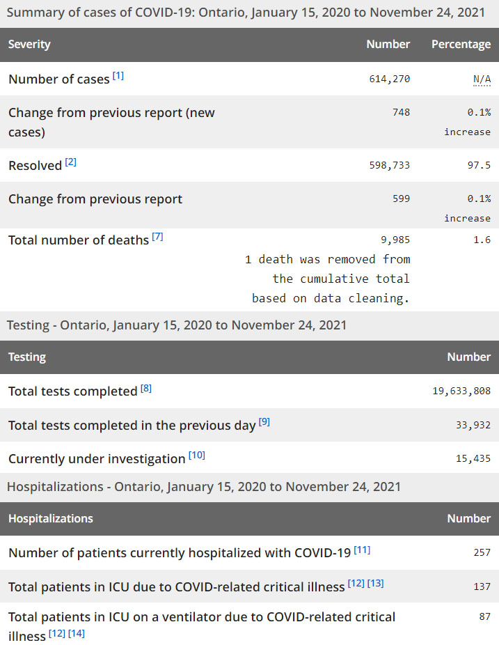 安省新冠科学咨询组估计,截至11月21日,安省的每日新增感染人数大约每四个半星期翻一番。尽管安省34个公共卫生单位中的大多数病例仍在增加,但重症监护室的负担或多或少继续保持稳定。截至11月25日晚上,安省有257例住院患者,有137例在重症监护病房,其中有87例在呼吸机上。当天还新增4例死亡病例,使官方死亡总数达到9,985。