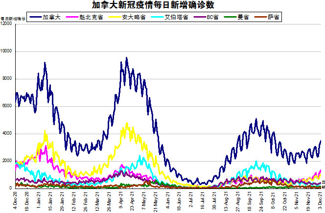 随着Omicron在加拿大出现以及Delta变异病毒继续在社区内传播,“第四波”疫情继续在加拿大延续着。加国生活网小编专门统计了从2020年12月4日至2021年12月3日的五个省份的新增确诊数,并制作了如下曲线图,让大家能一目了然地了解加拿大新冠疫情的发展趋势。加拿大当日新增3487例,按新增确诊数由多至少的排列分别是:魁省新增1355、安省新增1031、BC省新增404、艾省新增349、曼省新增142、新不伦瑞克省97(未在下图中显示)、萨省新增80。