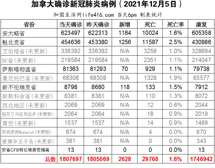 【加国生活网编译报道】截至2021年12月5日下午6点,加拿大新冠确诊病例总数为1807697(新增2628),死亡29768(新增2)。安省确诊总数623497(新增1184);魁省确诊总数454636(新增1256);新不伦瑞克省8798(新增118);萨省确诊总数81363(新增70);其余省份逢周末不更新。安省在12月5日新增1184例确诊病例,不仅连续第三天超过1千例,而且还创自5月28日以来的最高纪录,5月28日当天新增1273例。连续七天平均每天新增926例,周同比增加22%,一周前是761例。加国生活网专门制作了如下统计数据表: