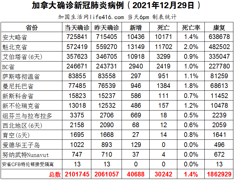 【加国生活网编译报道】截至2021年12月29日下午6点,加拿大新冠确诊病例总数为为2101745(新增40688,其中有2个省份是6天数据,当天实际新增32545),死亡30242(新增24)。安省确诊总数725841(新增10436);魁省确诊总数572419(新增13149);艾省确诊总数357623(6天新增10918);BC省确诊总数246671(新增2940);萨省确诊总数83855(新增297);曼省确诊总数77485(新增946);新斯科舍省确诊总数15823(新增586);新不伦瑞克省确诊总数13018(新增486)。由omicron变异病毒所引发的“第五波”疫情继续在加拿大各地大爆发,多个省份均在当天创下了自疫情以来的单日最高纪录。加国生活网专门制作了如下统计数据表: